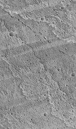 This Mars Global Surveyor (MGS) Mars Orbiter Camera (MOC) picture shows alternating light and dark wind streaks superimposed over a rugged lava flow surface on the west flank of the volcano, Ascraeus Mons. A chain of pits in the upper half of the image mark the location of a collapsed lava tube. The image is located near 11.6°N, 105.5°W, and covers an area about 3 km (1.9 mi) across. The scene is illuminated by sunlight from the lower left.
