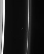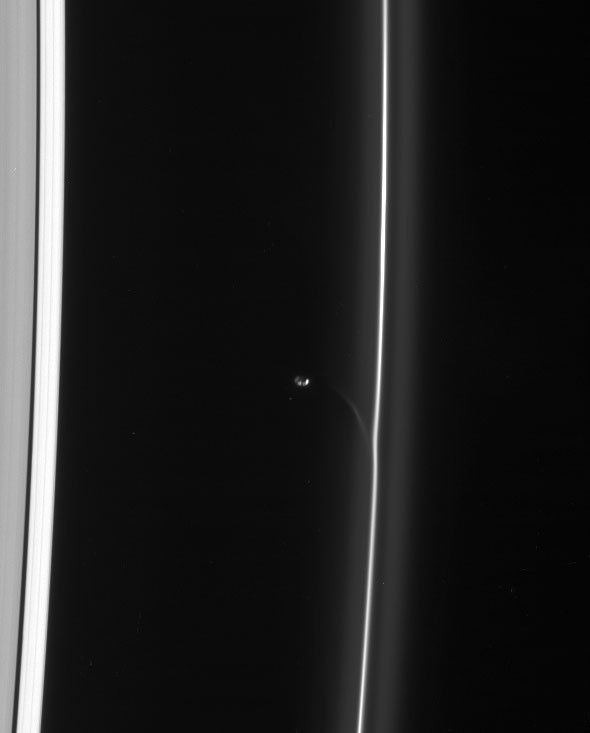 Prometheus draws a fresh streamer of material from the F ring as it passes the ring's interior edge. The streamer will continuously shear out as it orbits the planet, becoming more elongated and increasingly aligned with the F ring with time.