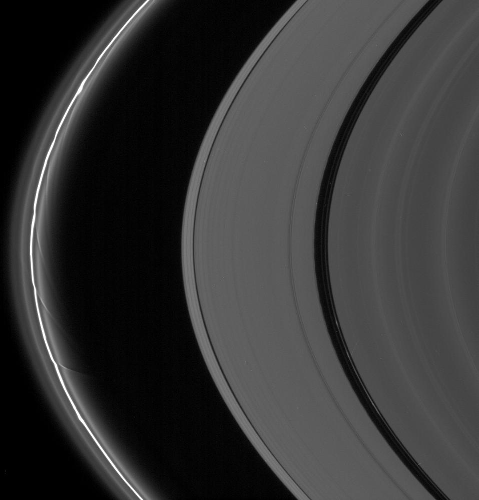 The image was taken in visible light with the Cassini spacecraft narrow-angle camera on Oct. 7, 2006 at a distance of approximately 1.9 million kilometers (1.2 million miles) from Saturn and at a Sun-Saturn-spacecraft, or phase, angle of 163 degrees. Image scale is 11 kilometers (7 miles) per pixel.
