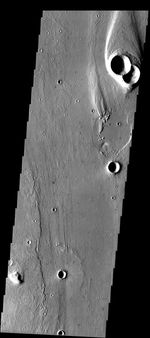 Note: this THEMIS visual image has not been radiometrically nor geometrically calibrated for this preliminary release. An empirical correction has been performed to remove instrumental effects. A linear shift has been applied in the cross-track and down-track direction to approximate spacecraft and planetary motion. Fully calibrated and geometrically projected images will be released through the Planetary Data System in accordance with Project policies at a later time.