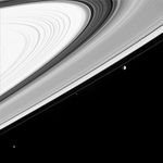 Moons visible in this image: Mimas (398 kilometers, or 247 miles across) at right, Pandora (84 kilometers, or 52 miles across) near center and Janus (181 kilometers, or 113 miles across) in the lower left corner. Mimas' orbit inclination of 1.6 degrees relative to Saturn's equator is enough to make it appear as if it orbits just beyond the F ring when viewed from this vantage point of 5 degrees below the rings. In fact, it is 34,000 kilometers (21,000 miles) more distant than Janus.