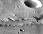 Nirgal Vallis is one of a number of canyons called valley networks or runoff channels. Much of the debate concerning the origin of these valleys centers on whether they were formed by water flowing across the surface, or by collapse and upslope erosion associated with groundwater processes. At the resolution of this image, it is just barely possible to discern an interwoven pattern of lines on the highland surrounding the valley, but it is not possible to tell whether this is a pattern of surficial debris (sand or dust), as might be expected with the amount of crater burial seen, or a pattern of drainage channels. With 4X better resolution from its mapping orbit, MOC should easily be able to tell the difference between these two possibilities.