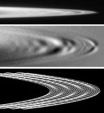 These images, derived from data obtained by NASA's Galileo spacecraft, show the subtle ripples in the ring of Jupiter that scientists have been able to trace back to the impact of comet Shoemaker-Levy 9 in July 1994. The top image was obtained by Galileo on Nov. 9, 1996, and shows the tip of the Jovian ring. The middle image is a version of the same image that has been computer-enhanced to show the ripples. The third image shows a computer model derived from the data.