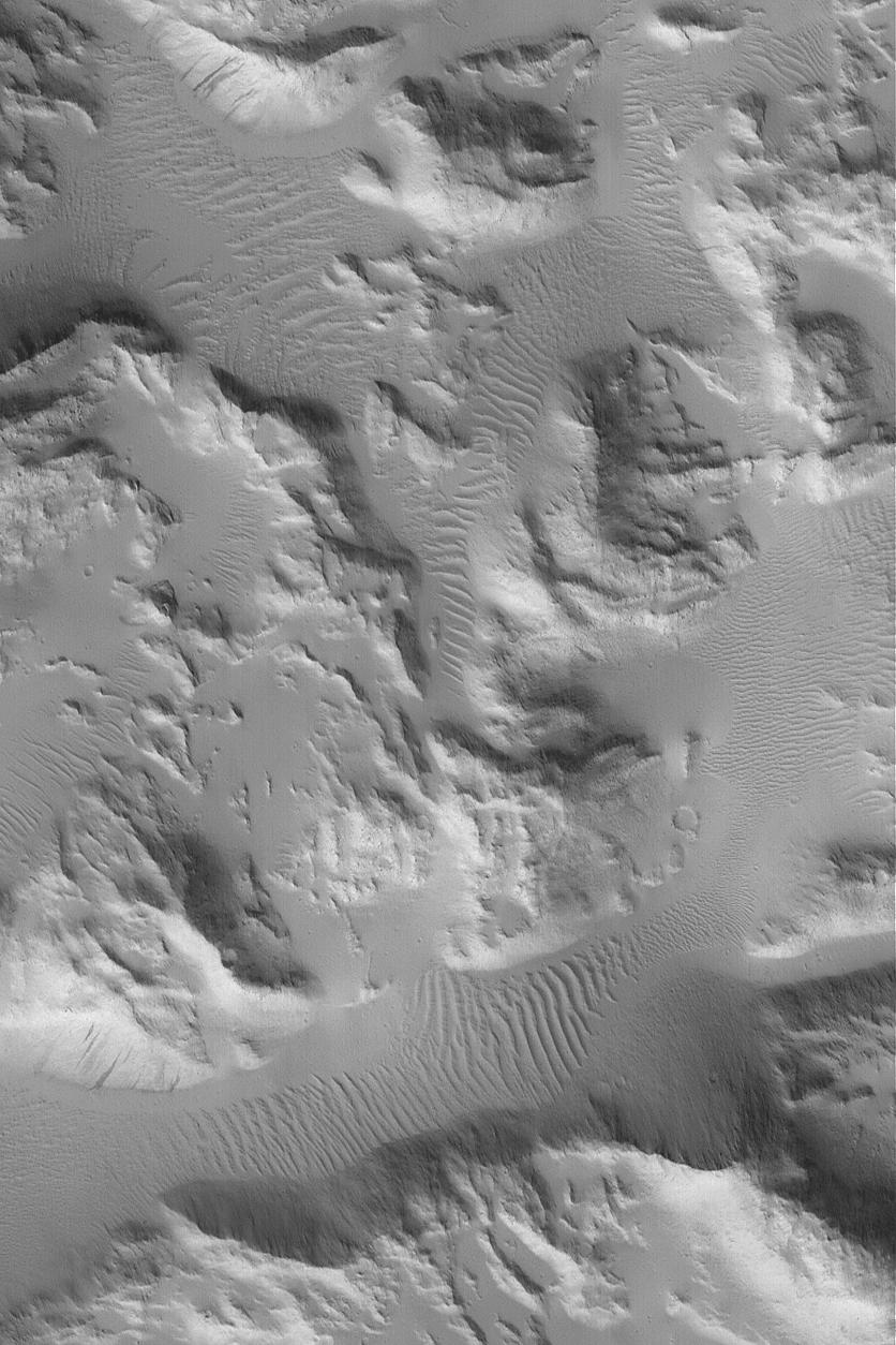 The Sulci Gordii are a grouping of ridges -- almost like small, rocky mountains -- located east of the giant volcano, Olympus Mons. This Mars Global Surveyor (MGS) Mars Orbiter Camera (MOC) image shows a 3 km (1.9 mi) -wide portion of the Sulci Gordii region. The rugged hills and mountains have been mantled by a blanket of fine dust. Ripple-like dunes in the troughs between each hill or mountain have also been covered with dust, indicating that they are inactive in the present martian environment. This image is located near 21.2°N, 124.2°W. Sunlight illuminates the scene from the lower left.