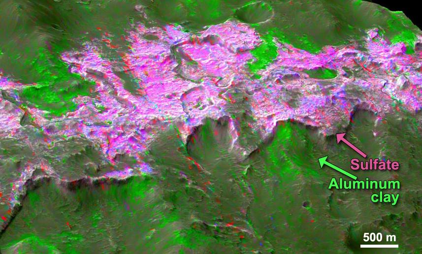 Sulfates are found overlying clay minerals in sediments within Columbus Crater, a depression that likely hosted a lake in the past. Sulfate salt deposits ring the crater like a bathtub ring and were deposited after the clays, as the lake dried out. The image combines information from two instruments on NASA's Mars Reconnaissance Orbiter, the Compact Reconnaissance Imaging Spectrometer for Mars and the Context Camera. (Reference: Wray et al., 2011.)