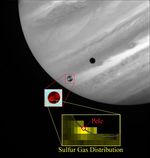 This image depicts the discovery of sulfur gas in the plume of the Pele volcano on Jupiter's moon Io, as seen by the Hubble Space Telescope in October 1999, during a flyby of Io by NASA's Galileo spacecraft. The main image shows Io passing in front of Jupiter as seen by Hubble's Wide-Field Planetary Camera (WFPC2) in near-ultraviolet light. The small inset shows that when a WFPC2 image at shorter ultraviolet wavelengths is included in a color composite with the near-ultraviolet image, Io's Pele plume appears as a dark smudge off the edge of Io's disk, silhouetted against Jupiter. The larger inset shows data from Hubble's Space Telescope Imaging Spectrograph, which mapped the composition of Pele's plume by analyzing the ultraviolet light from Jupiter which had passed through the plume. The regions shown in yellow were rich in sulfur gas, which was precisely centered over the Pele volcano, whose position is shown along with the edge of Io's disk.