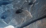 Here, we see the dark dunes in the summer, bare of seasonal frost. Two classic barchan dunes march across the rugged terrain. The long dark dune is crossing transverse aeolian ridges probably formed in a previous climate regime.