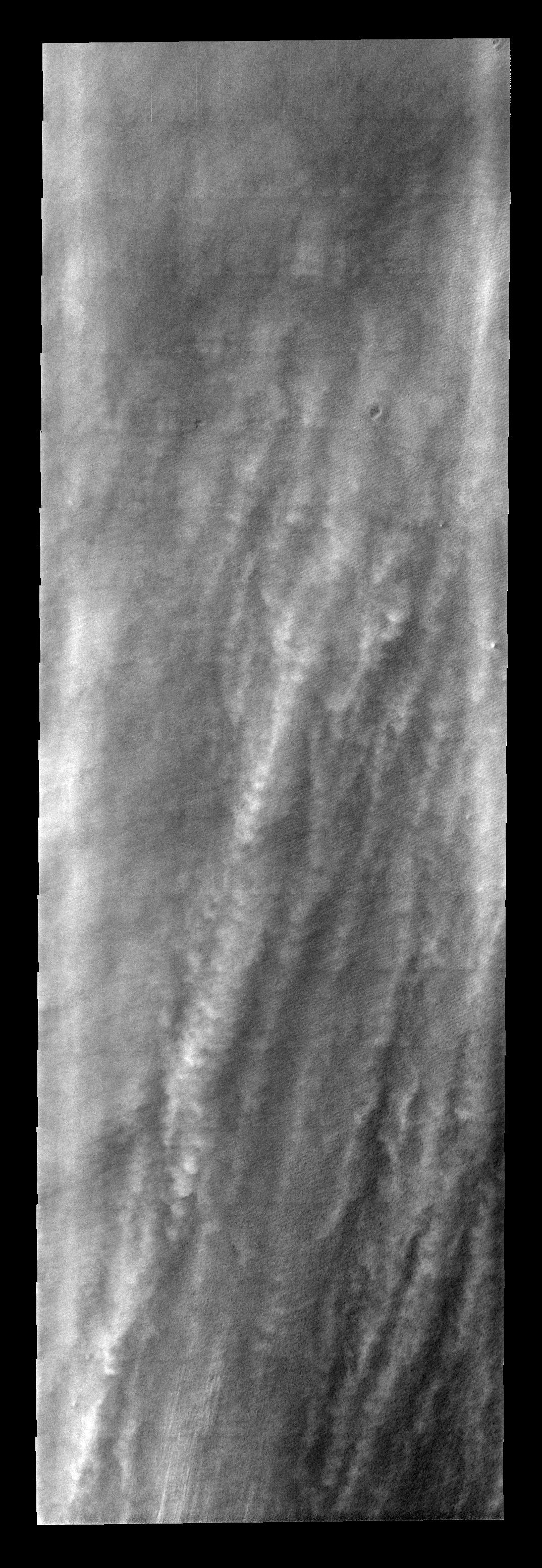 Note: this THEMIS visual image has not been radiometrically nor geometrically calibrated for this preliminary release. An empirical correction has been performed to remove instrumental effects. A linear shift has been applied in the cross-track and down-track direction to approximate spacecraft and planetary motion. Fully calibrated and geometrically projected images will be released through the Planetary Data System in accordance with Project policies at a later time.