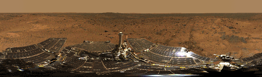 The image is an approximately true-color rendering using the 750-nanometer, 530-nanometer and 480-nanometer filters for the surface, and the 600-nanometer and 480-nanometer filters for the rover deck. Image-to-image seams have been eliminated from the sky portion of the mosaic to better simulate the vista a person standing on Mars would see.