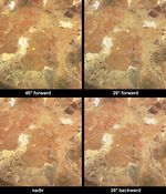 These four images were acquired on 8 April 2003, when the MISR camera closest to the specular reflection angle (the angle at which a perfect mirror reflects light) was the 26 forward-pointing camera. The solar fields can be readily identified by comparing the 26 forward camera view (top right-hand panel) with the other camera views, and also by using the animation, which covers the same geographic area but uses data acquired on 24 October 2000, when both the 60 and 46 forward cameras pointed close to the specular reflection angle. Since MISR's forward-viewing cameras point toward the Sun in the northern hemisphere, and because these parabolic reflectors move to track the Sun, only the forward-pointing cameras sometimes observe these solar fields near the specular reflection angle.