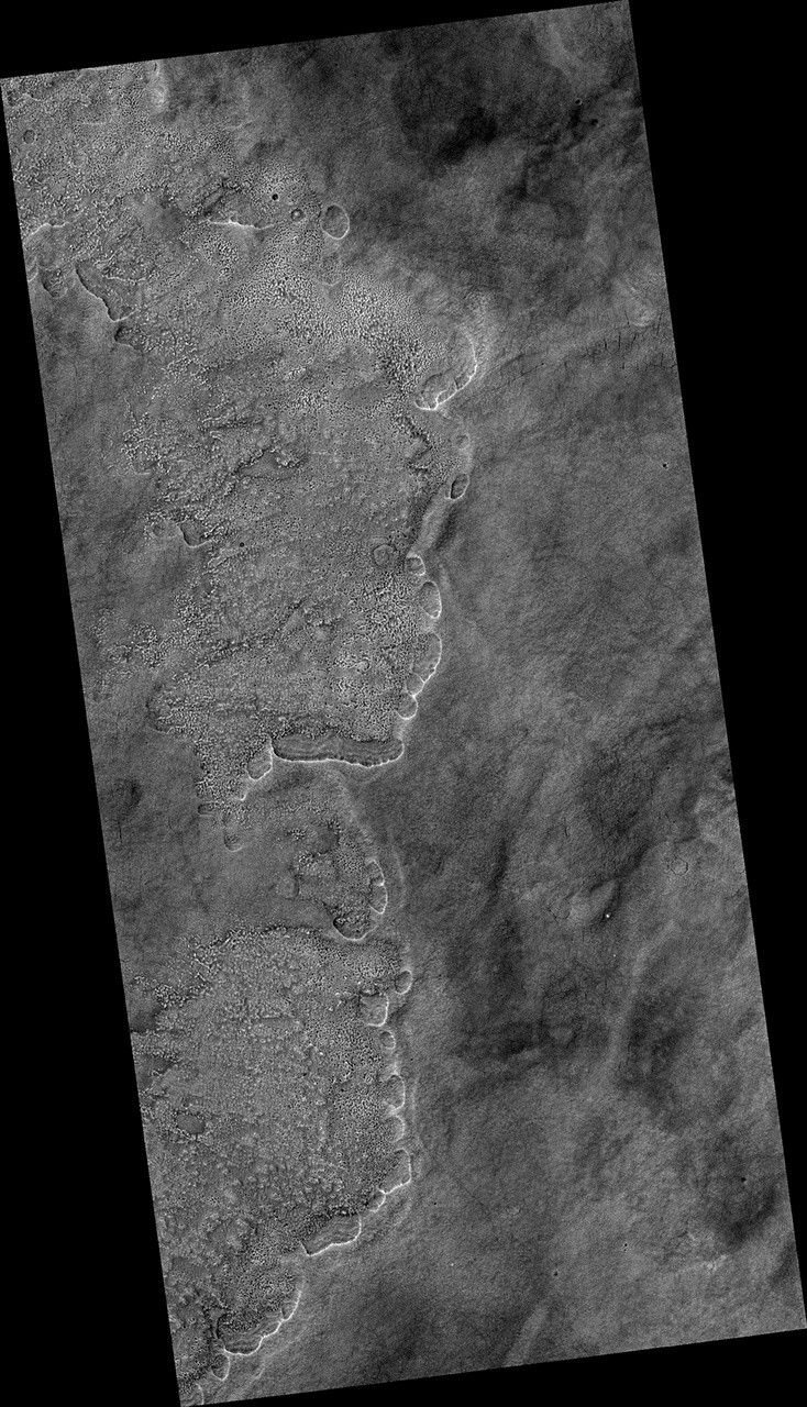 The objective of this observation was to examine the edge of impact ejecta from a crater to the north-west of this area (north is up, west is to the left). The ejecta visible in the top left of this image seems to be lower than the surrounding surface.