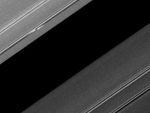 The moon is likely about a kilometer (half a mile) across. Disturbed ring material to the upper left and lower right of the moon reflects sunlight brightly and appears like a white airplane propeller. Several density waves are also visible in the ring. A spiral density wave is a spiral-shaped accumulation of particles that tightly winds many times around the planet. It is the result of gravitational tugs by individual moons whose orbits are in resonance with the particles' orbits at a specific distance from Saturn.
