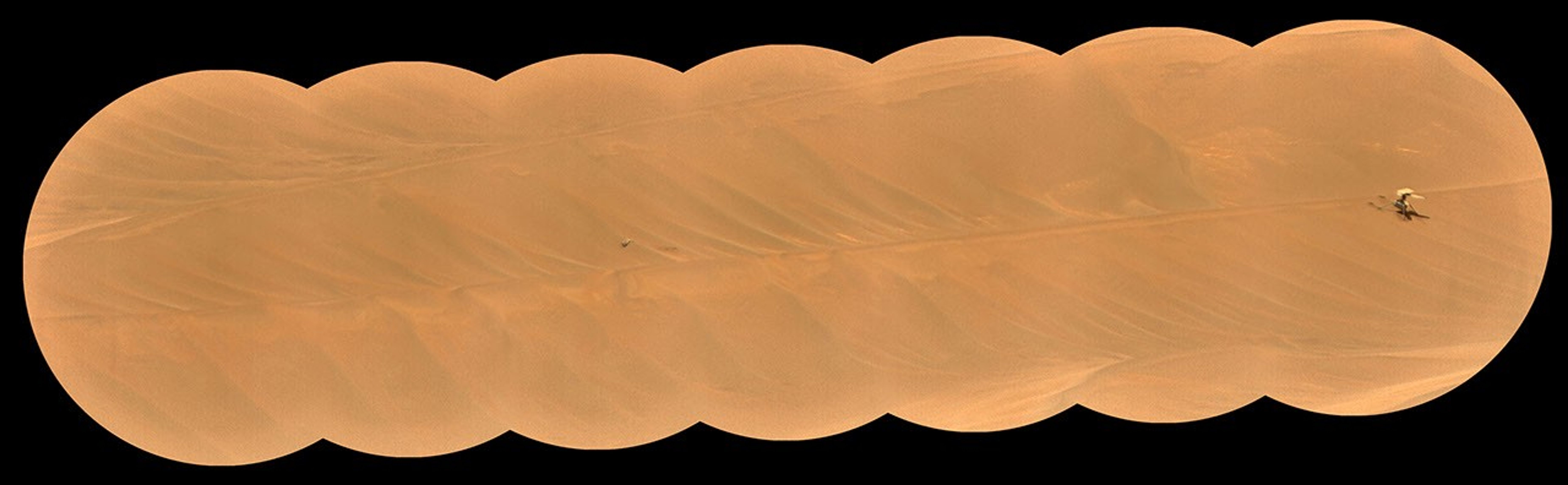 This mosaic is made up of seven images taken by the RMI, which is part of the rover's SuperCam instrument. At the time these images were taken, the distance between the rover and helicopter was about 1,365 feet (415 meters). Each circular image has a field of view of 26 feet (7.8 meters) at this distance.