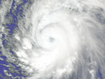 The AIRS sounder reveals important new information to supplement the familiar overhead views of hurricanes that come from satellites. Here AIRS shows some of the internal temperature structure of Supertyphoon Pongsona just as it hit the island of Guam last December of 2002. Each of the colored surfaces represents a particular temperature, from red and warm near the surface to yellow and very cold near the top. Normally, these so-called isotherms would be much smoother and nearly horizontal. Here we see how the latent heat released in convective updrafts causes the isotherms to bulge upward. This bulging is even seen more than 50,000 feet above sea level. This relatively warm air cap above a hurricane has rarely been observed and can only be measured with an instrument like AIRS. As we zoom in on the lower 30,000 feet, the temperature structure becomes more striking. It is even possible to discern a dip in the center at the lowest level, where cooler and drier air descends and forms the often cloud free eye of a hurricane.