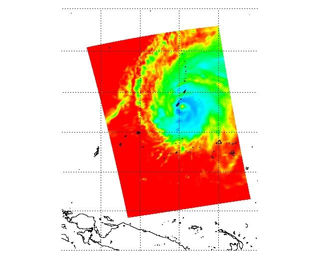 The image in figure 2 shows how the typhoon looks through an AIRS infrared "window" channel, which measures the temperature of the nearest impenetrable surface. Where the sky is clear, this window channel shows the surface of the Earth, otherwise it will show cloud tops. High cold clouds appear blue, while lower warmer clouds are green through orange. The Earth's surface, where it can be seen between the clouds, is warmest and appears red. Although the storm has a clearly defined eye, it is not cloud free and therefore shows up as yellow in this infrared image.