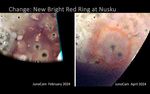 A red ring formed around Nusku Patera in the two months between the spacecraft's 58th flyby on Feb. 3, 2024, and its 60th on April 9, 2024. The ring obscures some nearby features like Creidne Patera. This ring, 683 miles (1,100 kilometers) wide is likely from a Pele-type plume rich in sulfur. Similar transient red rings were observed by NASA's Galileo mission around Grian Patera and Surt and were associated with intense but short-lived thermal "outburst" eruptions.