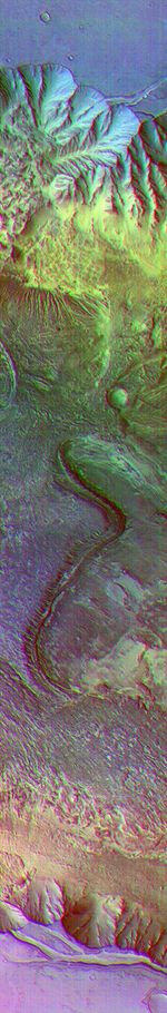 The image combines exposures taken by Odyssey's thermal emission imaging system at three different wavelengths of infrared light: 6.3 microns, 7.4 microns and 8.7 microns.