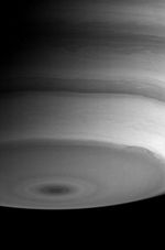 Saturn puts on a mesmerizing display in this image from August 7, 2004. Turbulent swirls and eddies are visible throughout the southern hemisphere. In particular, the boundary of the dark southern polar region displays a prominent oval-shaped storm near the lower right.