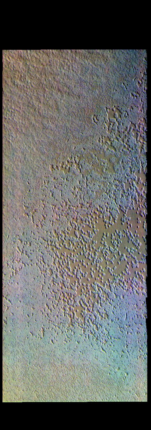 This false color image shows pits on the south polar cap. The terrain has the appearance of a slice of swiss cheese, giving rise to the informal name. This is thought that these depressions form by sublimation. Sublimation is the process where the solid changes directly into a gas phase - ie. no fluid form in between the solid and gaseous forms. Sublimation occurs due to the arrival of the sun in the spring and summer seasons at the pole. These pits have been shown to grow in size over a short time period, with the surface changing over the course of years rather than thousands of years.
