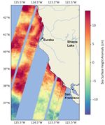 Warm ocean waters from the developing El Niño are shifting north along coastlines in the eastern Pacific Ocean. Along the coast of California, these warm waters are interacting with a persistent marine heat wave that recently influenced the development of Hurricane Hilary. SWOT is able to spot the movement of these warm ocean waters in unprecedented detail.