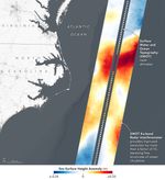 This visualization shows sea surface height measurements in the Gulf Stream off the coast of North Carolina and Virginia. The data was collected on Jan. 21, 2023, by an instrument on the Surface Water and Ocean Topography (SWOT) satellite called the Ka-band Radar Interferometer (KaRIn). KaRIn's two antennas acquired data that was mapped as two wide, colored strips spanning a total of 75 miles (120 kilometers) across.