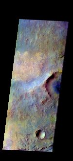 The THEMIS VIS camera contains 5 filters. The data from different filters can be combined in multiple ways to create a false color image. These false color images may reveal subtle variations of the surface not easily identified in a single band image. Today's false color image shows part of Syrtis Major Planum.