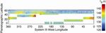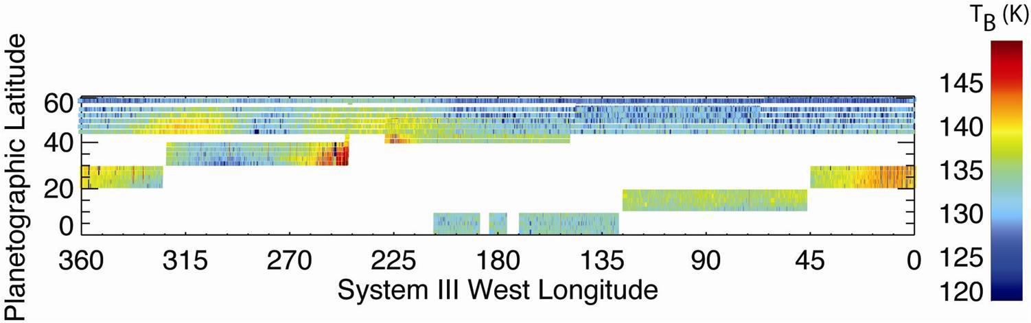 Measurements by NASA's Cassini spacecraft reveal temperatures in a high layer of Saturn's atmosphere known as the stratosphere and show the dramatic effects of the massive storm deep below. In these data from Cassini's composite infrared spectrometer, red indicates warm temperatures in the storm region (20 to 40 degrees latitude). They shine like stratospheric "beacons" that flank the disturbance. Blue indicates cold temperatures over the central region of the storm. These temperatures were measured at a wavelength of 7.7 microns.
