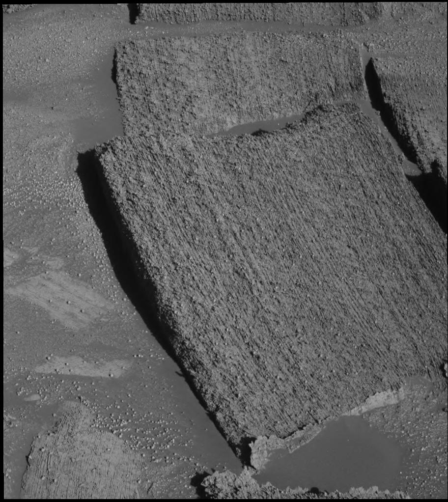 On the way out of "Endurance Crater," NASA's Mars Exploration Rover Opportunity has been making observations along the crater wall, an intriguing and revealing geological path. One factor that immediately caught the eyes of scientists was a noticeable difference between light rocks and dark rocks along the crater rim. The pictured rock, "Tipuna," lies just under the dividing line, in the dark section. Opportunity's panoramic camera took this image during the rover's 306th martian day, or sol (Dec. 3, 2004). The image gives an up-close view of Tipuna, revealing complex layering that was likely caused by ancient flowing water or wind deposition. Scientists have used the rover's rock abrasion tool to expose interior material for analysis on both dark and light rocks near Tipuna.