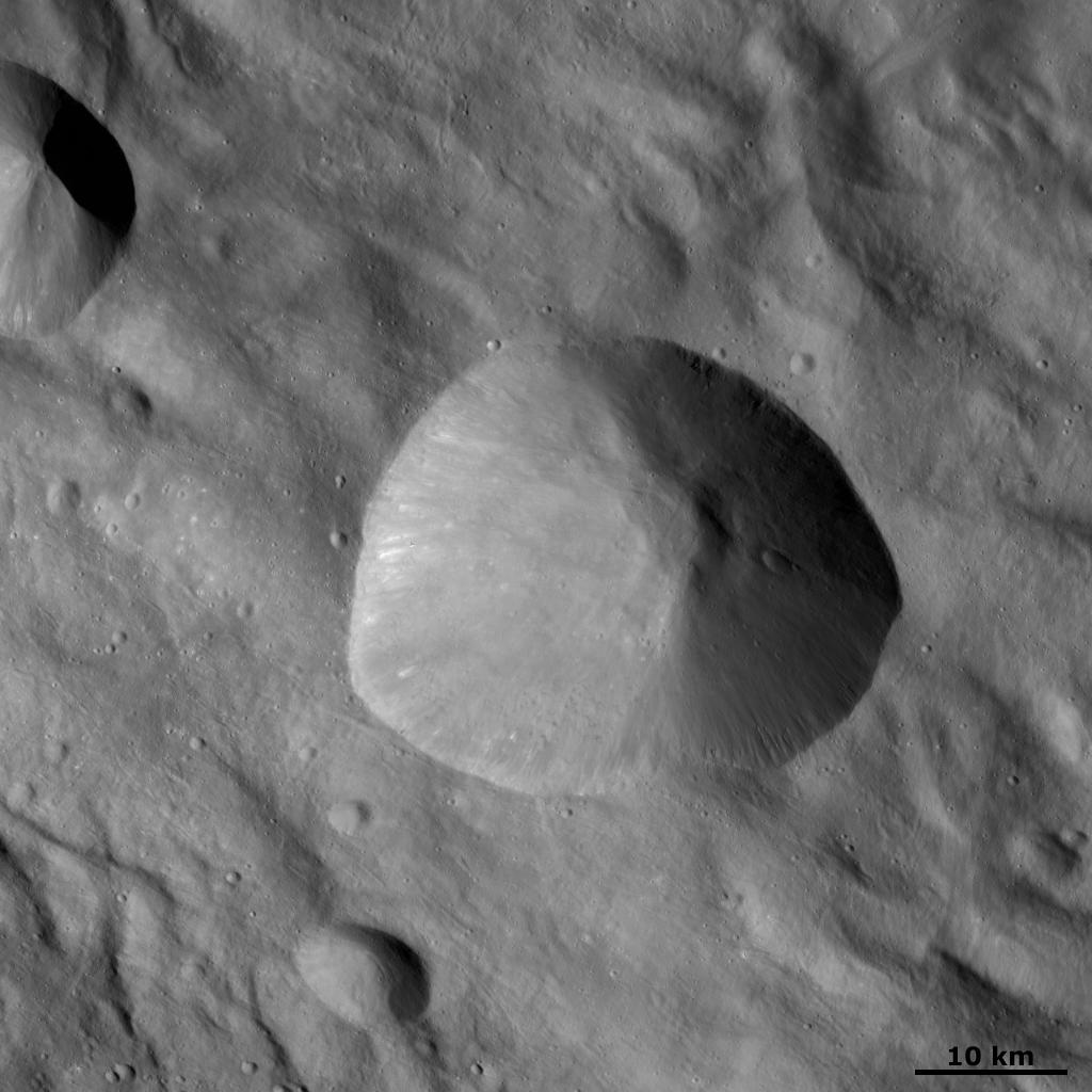 This image is located in Vesta's Rheasilvia quadrangle, near Vesta's south pole. NASA's Dawn spacecraft obtained this image with its framing camera on Oct. 18, 2011. This image was taken through the camera's clear filter. The distance to the surface of Vesta is 700 kilometers (435 miles) and the image has a resolution of about 70 meters (230 feet) per pixel. This image was acquired during the HAMO (high-altitude mapping orbit) phase of the mission.