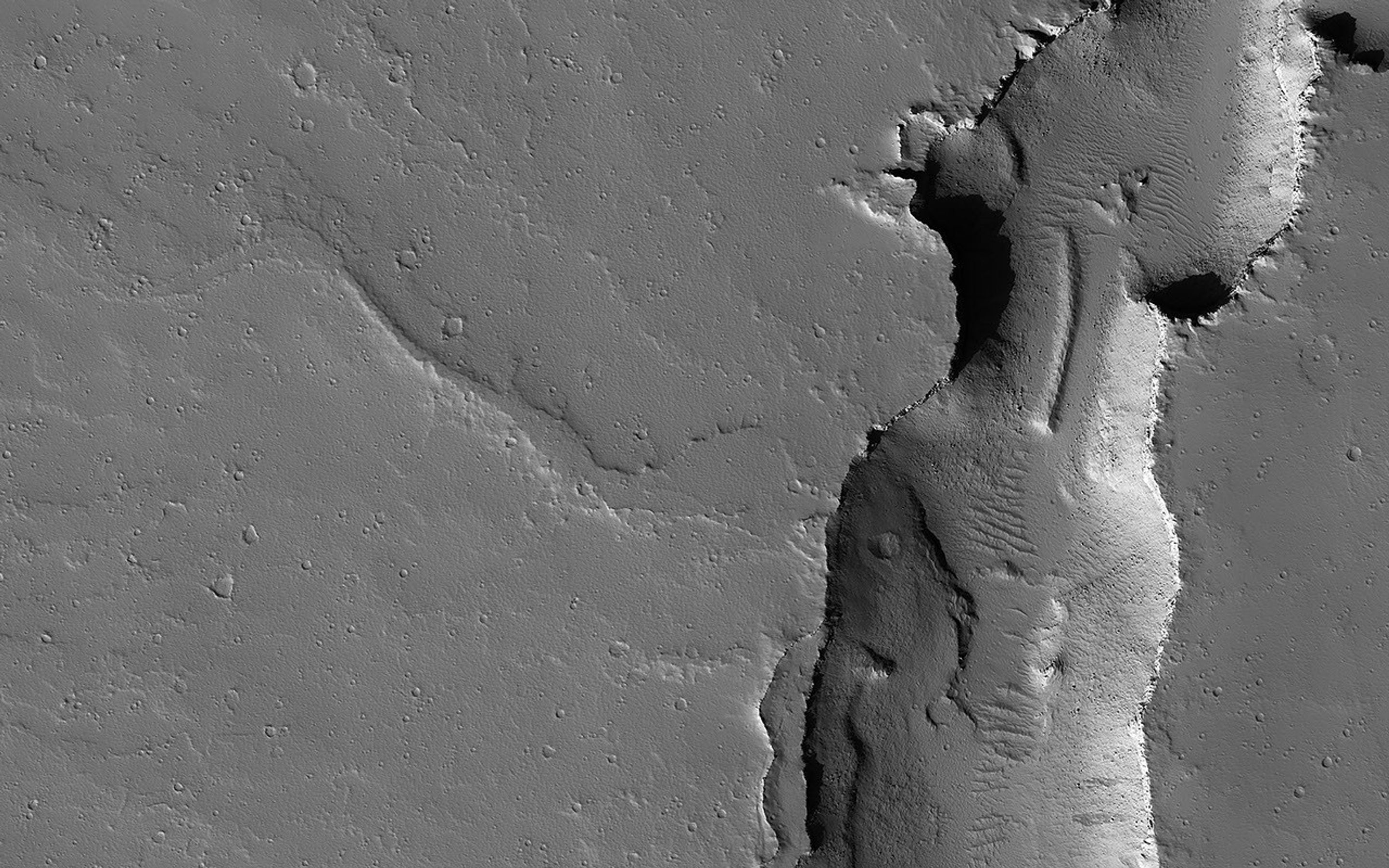 This image acquired on August 29, 2022 by NASA's Mars Reconnaissance Orbiter shows two cross-cutting depressions that may have been formed by the collapse of weak terrain along pre-existing faults.