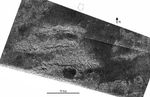 The ridges, which appear on the left side of the image, are rugged features and are elevated above surrounding terrain. The brightness patterns mean that the materials are fractured or blocky at the radar wavelength (2.17 centimeters, or about 1 inch). Along the south sides of the ridges are prominent cliffs, or scarps, present as thin, radar-dark lines trending west-to-east, and interpreted as faults. These features are dark due to shadowing from the radar illumination, and have heights up to a few hundred meters (several hundred feet), based on preliminary estimates of slopes.