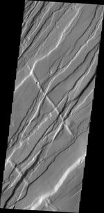 Today's VIS image is shows a small portion of Tempe Fossae. The fossae is comprised of paired, parallel fractures with a down-dropped block between the fracture set.