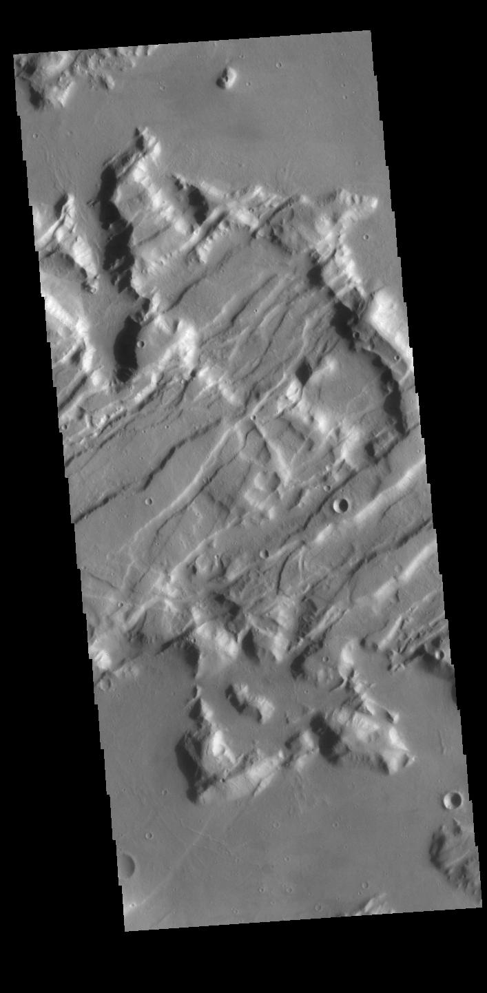Today's VIS image is shows a small portion of Tempe Fossae. The fossae are graben comprised of paired, parallel fractures with a down-dropped block of material between the fracture set. This morphology is created by extensional tectonic stresses. This image is located in a region of Tempe Terra that is complexly fractured. The complete fossae system in almost 2000 km (1242 miles) long.