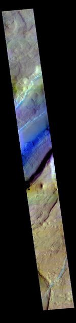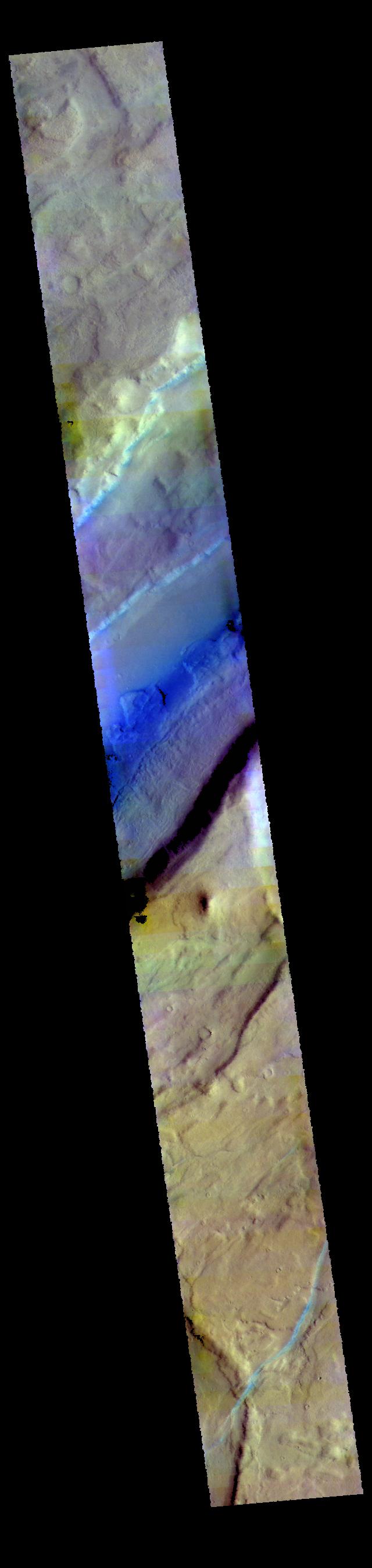 The THEMIS VIS camera contains 5 filters. The data from different filters can be combined in multiple ways to create a false color image. These false color images may reveal subtle variations of the surface not easily identified in a single band image.