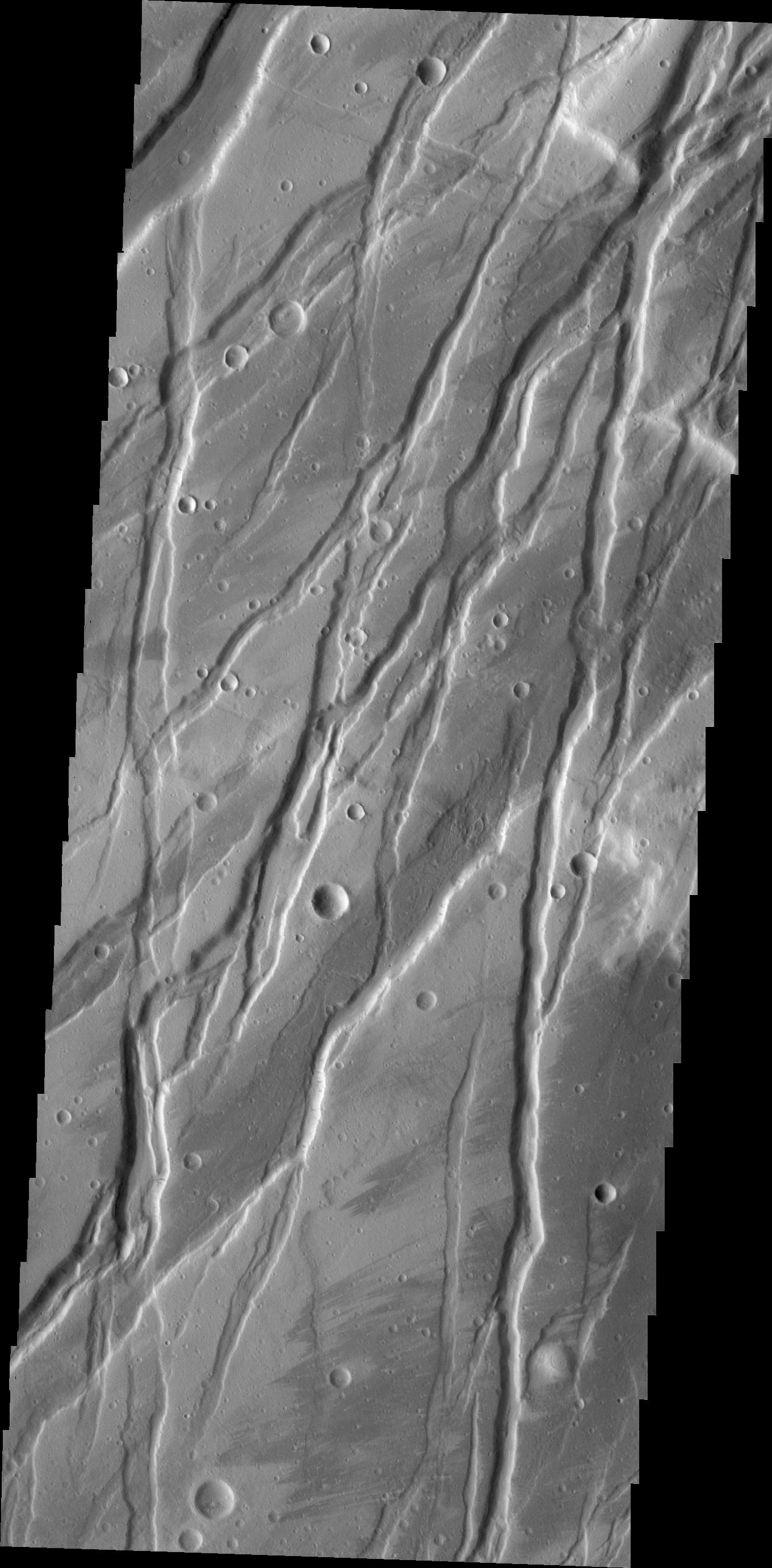 Today's VIS image shows a portion of Tempe Fossae, a region of parallel to subparallel paired fractures called graben.