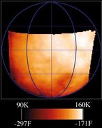 To compare this temperature map to surface features of Ganymede, you can look at this Ganymede Image taken during the Ganymede 1 orbit. The PPR map covers almost the same area as the image but is rotated about 30 degrees to the west.