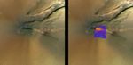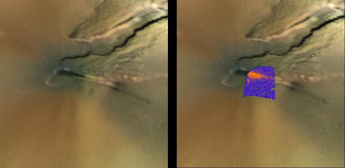 Pele, one of Io's best-known volcanoes, was observed by the infrared spectrometer, an instrument onboard NASA's Galileo spacecraft, during the flyby of Jupiter's moon Io on February 22, 2000. The temperature map is shown here on the left in false color, superimposed on a visible color image of the Pele region obtained by the Voyager spacecraft in 1979. The red color represents the hottest lava flows. The purple colors are cooler materials. Preliminary results show that the temperatures of the hottest lava flows are at least 1,400 Kelvin (about 2,000 Fahrenheit), consistent with the temperatures of basaltic lava seen on the Kilauea volcano in Hawaii. It is possible that the eruption temperatures at Pele are even higher, as lava cools quickly once it starts to spread over the surface. The Voyager context image is 200 kilometers (124 miles) across.