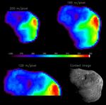 The derived temperature varies from 260 +/- 6K to 329 +/- 8K. Shadows are the coolest temperatures, and the point directly below the sun is hottest. These temperatures indicate that the thermal inertia of the surface (the quality of the surface describing the ability to conduct and store heat) is low. In other words, on Tempel 1, it is hot in the sun and cold in the shadows. A value for thermal inertia is estimated at <100 W/K/m2/s1/2.