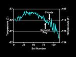 This chart plots the minimum daily atmospheric temperature measured by NASA's Phoenix Mars Lander spacecraft since landing on Mars. As the temperature increased through the summer season, the atmospheric humidity also increased. Clouds, ground fog, and frost were observed each night after the temperature started dropping.