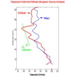 This figure compares the most recent temperature profile derived from the Pathfinder ASI accelerometer data during entry, with the Viking 1 entry profile. The nominal profile is given by the solid red line and the thin red lines represent error estimates. Also shown is the temperature profile (Green) for which the saturated vapor pressure of CO2 is equal to the atmospheric pressure. At 80 km, the Pathfinder entry profile falls below the CO2 profile, and it is possible that CO2 ice clouds could form at this level. This profile also shows a temperature inversion at 10-12 km, which may mark the location of the water vapor ice clouds seen in the IMP camera sunrise images.