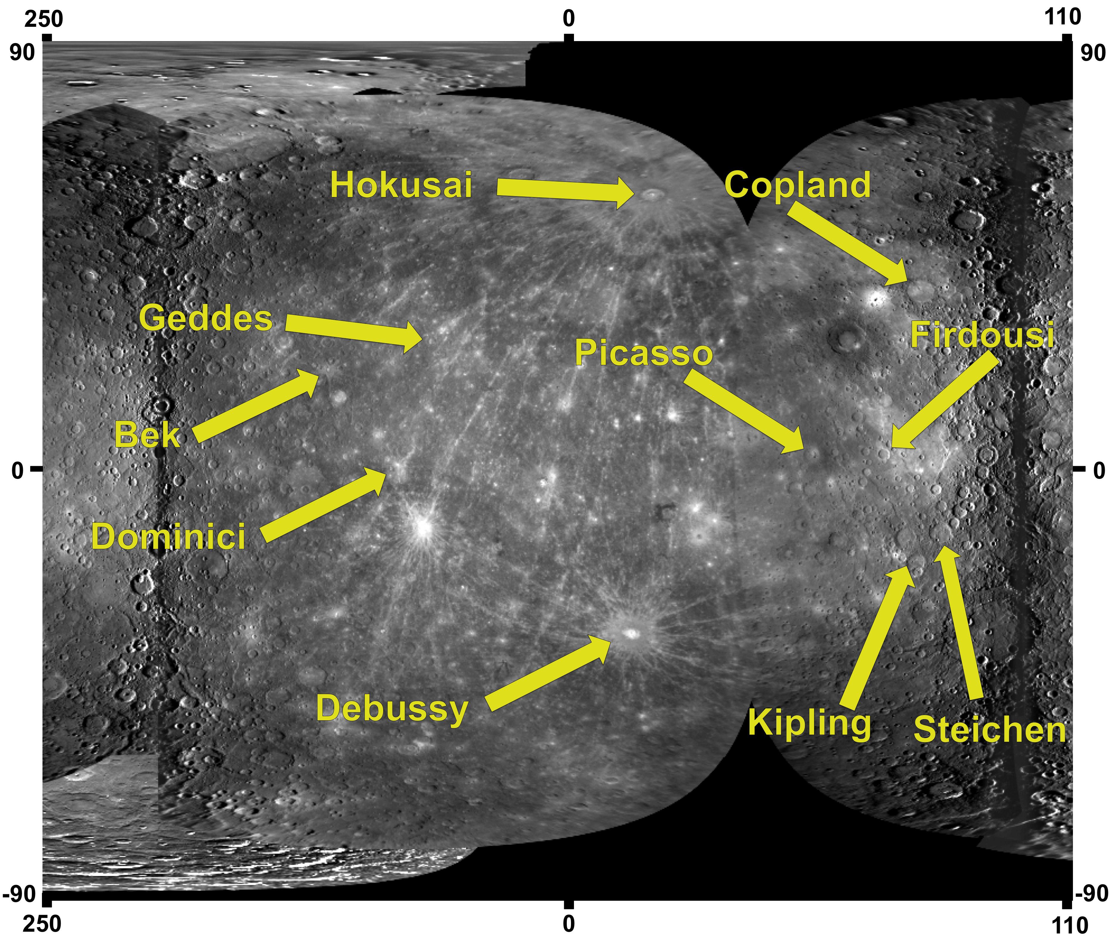 Craters on Mercury are named after "deceased artists, musicians, painters, and authors who have made outstanding or fundamental contributions to their field and have been recognized as art historically significant figures for more than 50 years." The rules for naming other features on Mercury can be found here. The process of proposing a new crater name includes gathering fundamental information about the crater, such as the crater's central latitude, central longitude, and diameter. Justification is provided as to why the crater is of sufficient scientific importance to be named, and details are provided about the name choice, including sources that support the worthy contributions made by that individual. These 10 newly named craters join 42 others named since MESSENGER's first Mercury flyby (PIA12428) in January 2008.