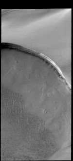 Tenuis Cavus is a region within the north polar cap where the underlying surface is visible. Ice comprises the top part of the image. Craters and sand dunes are visible on the ice-free surface.