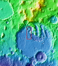 The THEMIS camera contains 5 filters. The data from different filters can be combined in multiple ways to create a false color image. These false color images may reveal subtle variations of the surface not easily identified in a single band image. Today's false color image shows part of Terby Crater.