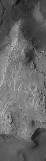 This Mars Global Surveyor (MGS) Mars Orbiter Camera (MOC) image shows light-toned, layered, sedimentary rock outcrops in the crater, Terby. The crater is located on the north rim of Hellas Basin. If one could visit the rocks in Terby, one might learn from them whether they formed in a body of water. It is possible, for example, that Terby was a bay in a larger, Hellas-wide sea.