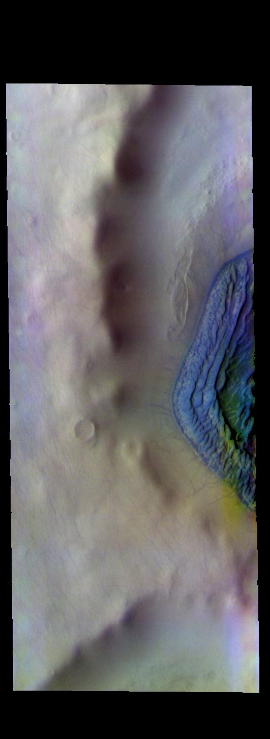 The THEMIS VIS camera contains 5 filters. The data from different filters can be combined in multiple ways to create a false color image. These false color images may reveal subtle variations of the surface not easily identified in a single band image. Today's false color image shows part of a crater in southern Terra Cimmeria. The dark blue feature on the right side of the image is a large sand dune complex. Dark blue in this false color combination indicates basaltic sands. Dunes at high latitudes — near the polar caps — are affected by seasonal frost and ice. The interactions with frost/ice reduces the amount of movement of sand grains within the dunes. This changes the morphology of near polar dunes when compared to dunes at lower latitudes where ice/frost do not occur as frequently. This crater's latitude is 68 degrees south of the equator.