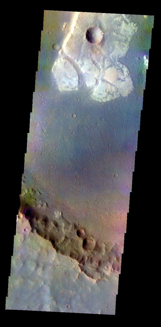 The THEMIS VIS camera contains 5 filters. The data from different filters can be combined in multiple ways to create a false color image. These false color images may reveal subtle variations of the surface not easily identified in a single band image. Today's false color image shows a unique, resistant material on the floor of an unnamed crater in Terra Cimmeria.