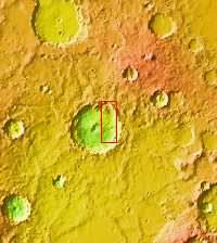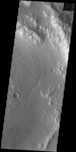 Today's VIS image shows part of an unnamed crater in southern Terra Cimmeria. The rim of the crater is dissected by several channels (top of image) and the floor contains a small group of sand dunes (bottom of image).