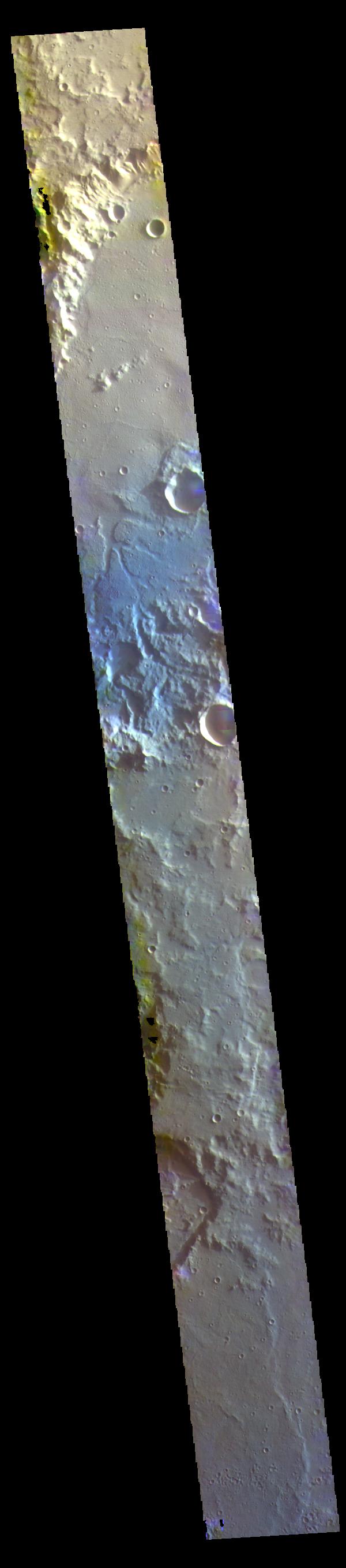 The THEMIS VIS camera contains 5 filters. The data from different filters can be combined in multiple ways to create a false color image. These false color images may reveal subtle variations of the surface not easily identified in a single band image. Today's false color image shows several craters located in Terra Cimmeria.