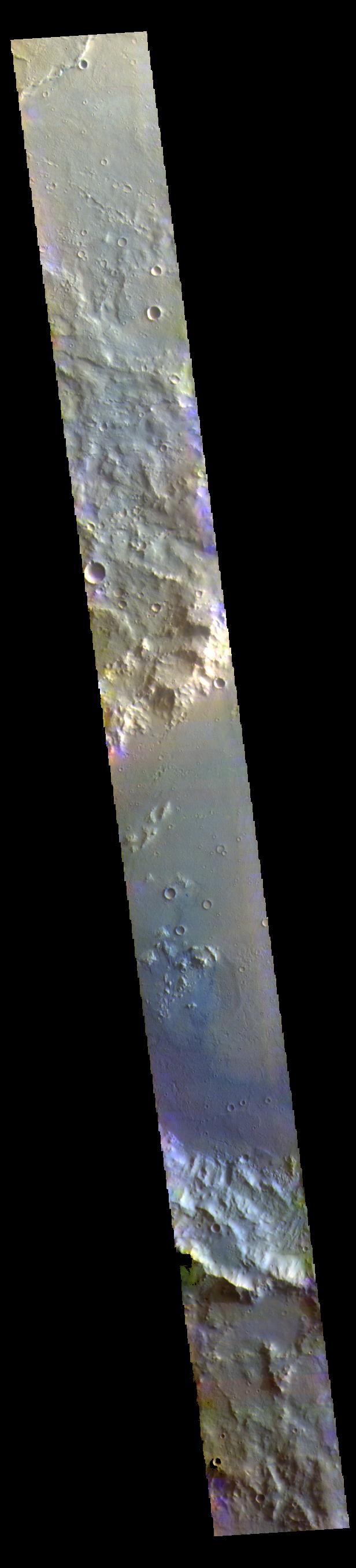 The THEMIS VIS camera contains 5 filters. The data from different filters can be combined in multiple ways to create a false color image. These false color images may reveal subtle variations of the surface not easily identified in a single band image.