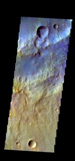 The THEMIS camera contains 5 filters. The data from different filters can be combined in multiple ways to create a false color image. These false color images may reveal subtle variations of the surface not easily identified in a single band image. Today's false color image shows part of the plains of Terra Cimmeria.